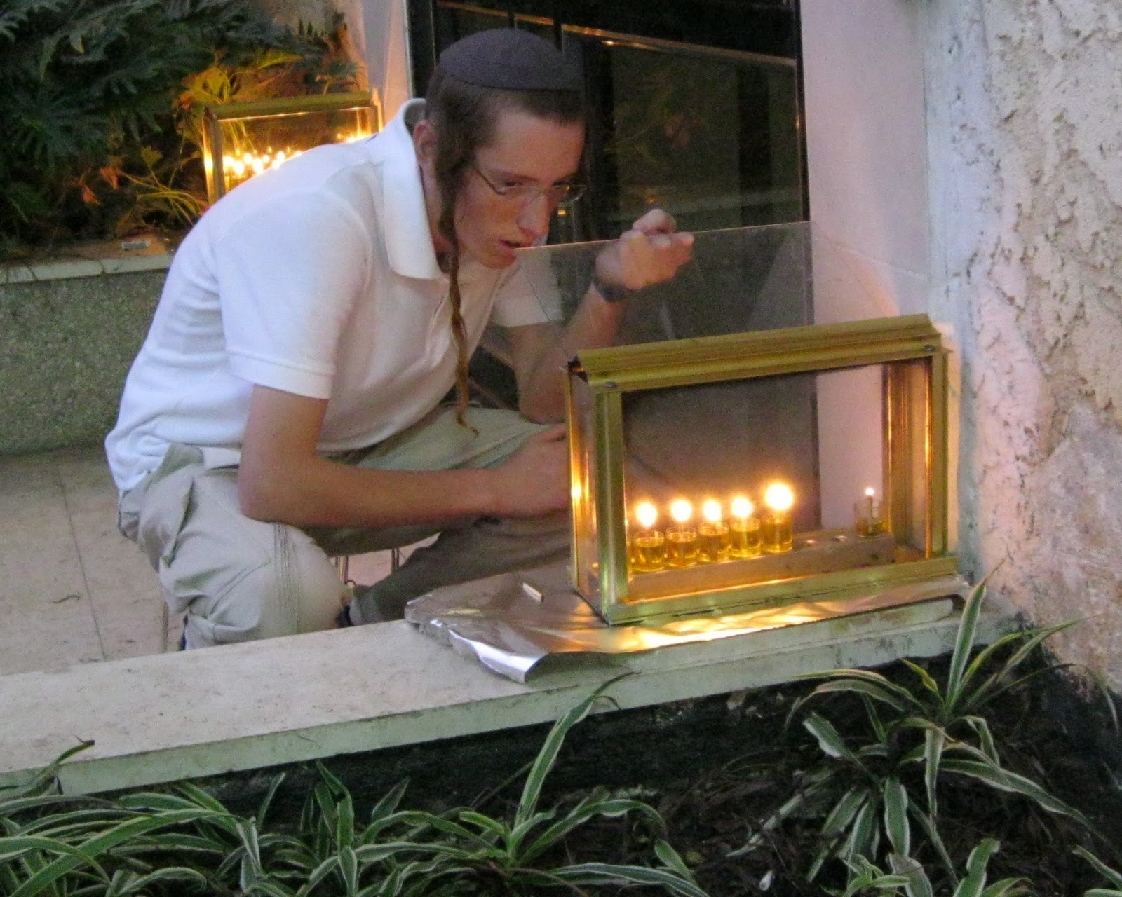 The photographs show our grandson Yahel lighting olive oil wicks of a hanukiah in which light from outside is reflected inside.